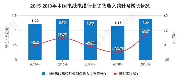 數(shù)據(jù)顯示,2015-2019年我國(guó)電線(xiàn)電纜銷(xiāo)售收入總體呈增長(zhǎng)態(tài)勢(shì),2019年中國(guó)電線(xiàn)電纜行業(yè)銷(xiāo)售收入達(dá)到1.4萬(wàn)億元,同比增長(zhǎng)21.70%。隨著電線(xiàn)電纜行業(yè)規(guī)模將不斷增加,電線(xiàn)電纜市場(chǎng)發(fā)展前景廣闊。